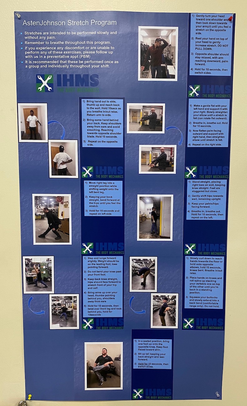 AJ Williston partnered with IHMS to prevent work-related injuries and enhance personal wellness. IHMS visits the site several times a month to provide care and resources. Stretching guide poster were created with AJ associates showing how to do the recommended exercises. Individuals are encouraged to perform these stretches throughout the day to help prevent injury.